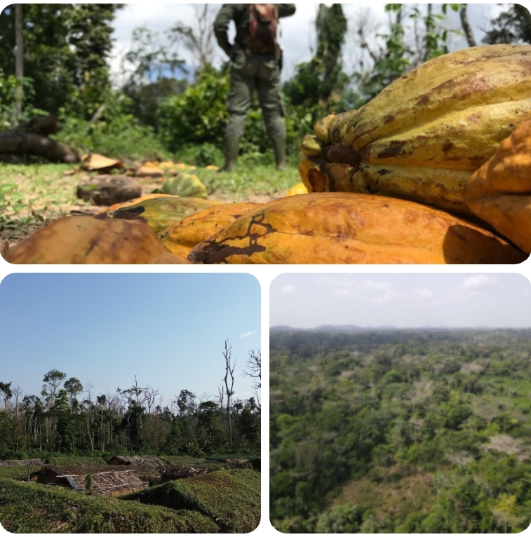 Composites photos of forests in Sinoe plus a man with pile of harvested cocoa.