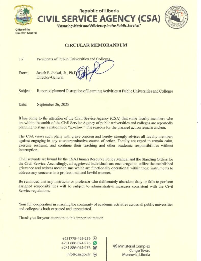 In a circular addressed to the presidents of public universities and colleges, CSA Director General Dr. Josiah F. Joekai expressed grave concern over reports of a planned nationwide “go-slow” by faculty members who fall under the CSA’s oversight.