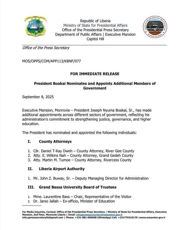 The group also said it strongly opposes the “irregular” and “unlawful” assignment of Cllr. Nah to River Gee County, referencing President Joseph Nyumah Boakai’s appointment of September 8, 2025 and the subsequent transfer of Cllr. Nah to River Gee without official communication from the President.