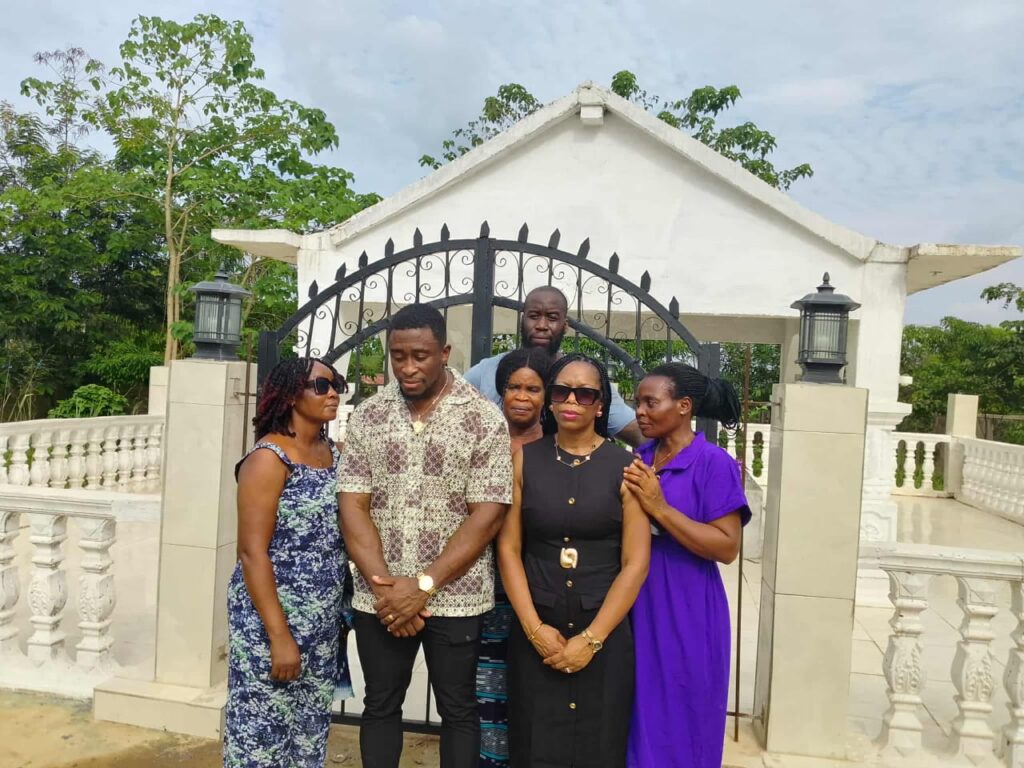 Kuly Teddy Doe and family pose for picture in front his parents burial home.