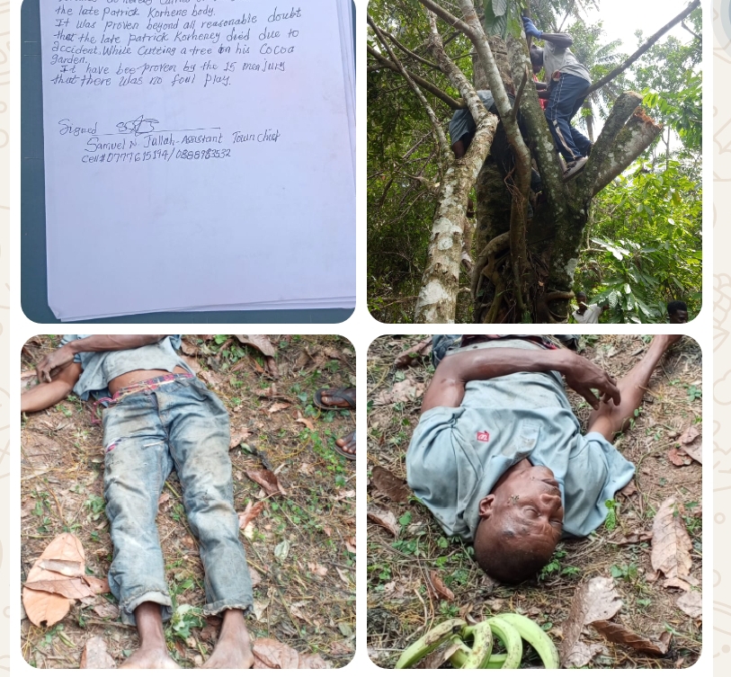 Kpandewowai Town, Kolahun District| Dec. 21, 2025 |In a tragic incident in the town of Kpandewowai in Kolahun District, a man identified as Patrick Korhena, 45, lost his life while cutting down trees in his cocoa garden. The incident, which occurred on Saturday, December 20, 2025 has left the community in utter shock and complete bewilderment.