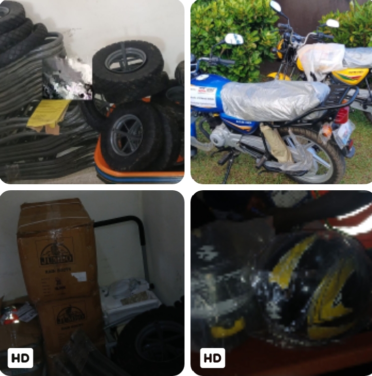 The donation included 50 cutlasses, 5 rakes, 30 wheelbarrows, 53 pairs of safety rain boots, 50 pairs of hand gloves, 53 safety vests, 10 road signs, 2 motorbikes and 1 signboard.