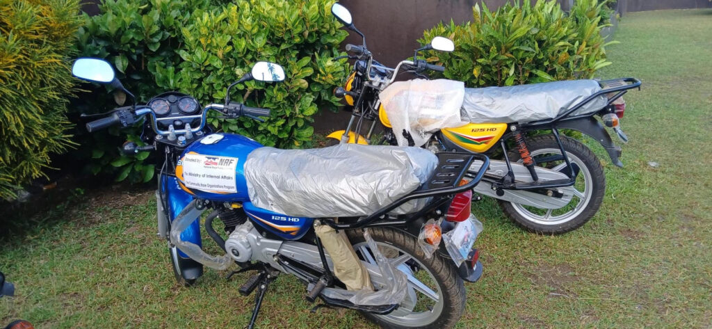 The donation included 50 cutlasses, 5 rakes, 30 wheelbarrows, 53 pairs of safety rain boots, 50 pairs of hand gloves, 53 safety vests, 10 road signs, 2 motorbikes and 1 signboard.