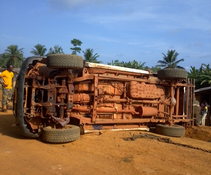 Accident: White Pick -Up overturned jammed packed with passengers and goods in Grand Kru County raising concerns regarding road safety across the county.