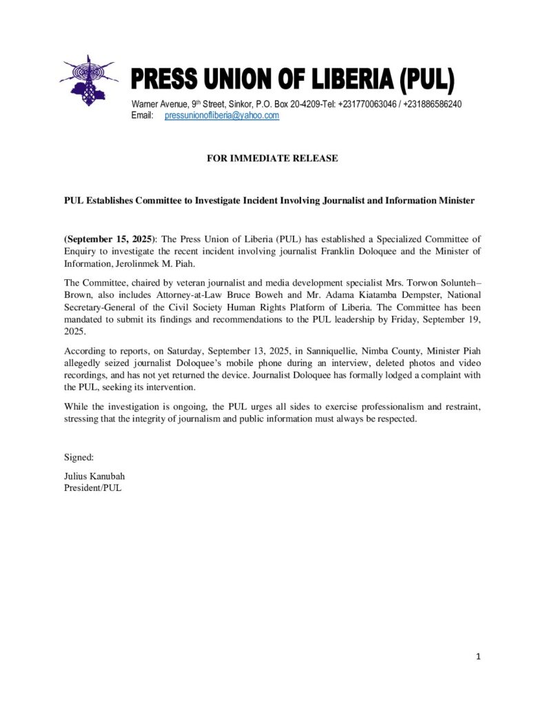 (September 15, 2025): The Press Union of Liberia (PUL) has established a Specialized Committee of Enquiry to investigate the recent incident involving journalist Franklin Doloquee and the Minister of Information, Jerolinmek M. Piah.
