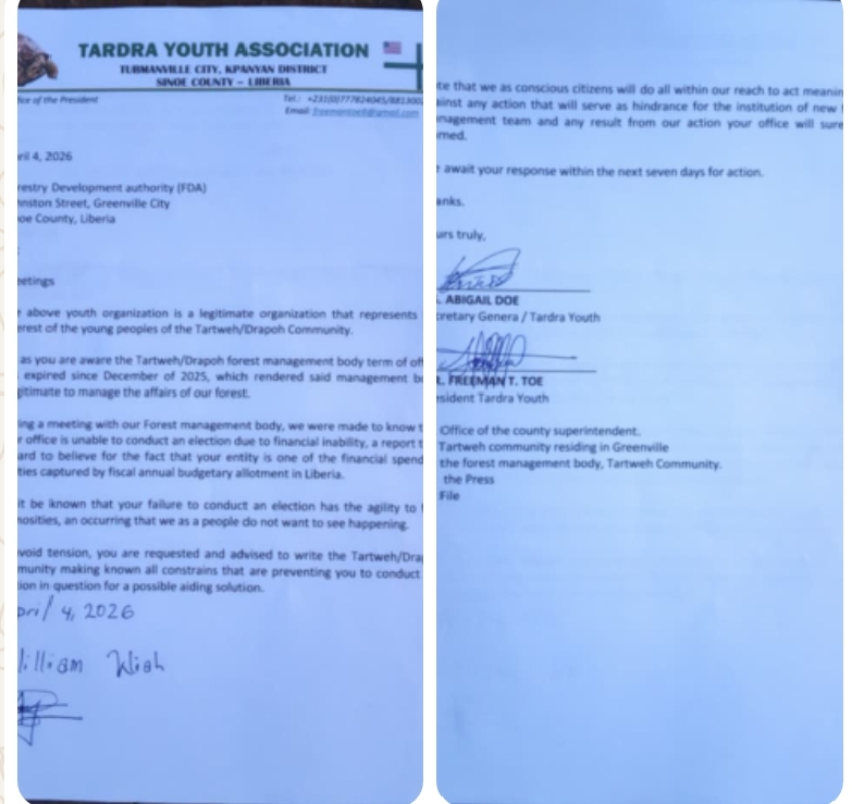 Monrovia, Liberia |April 11, 2026 | The Tardra Youth Association has issued a statement expressing concern over the expired term of the Tartweh/Drapoh Forest Management Body, calling on the Forest Development Authority (FDA) to conduct elections for a new management team.